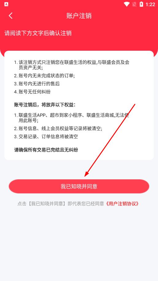 4、閱讀賬戶注銷的相關(guān)提示和條款后,點(diǎn)擊我已知曉并同意。