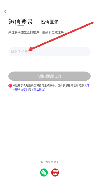 3、進(jìn)入短信登錄頁(yè)面,在輸入手機(jī)號(hào)的框中填寫自己的手機(jī)號(hào)碼。