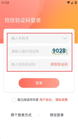 3、在登錄界面依次填寫手機(jī)號(hào)、圖片驗(yàn)證碼,點(diǎn)擊獲取短信驗(yàn)證碼。