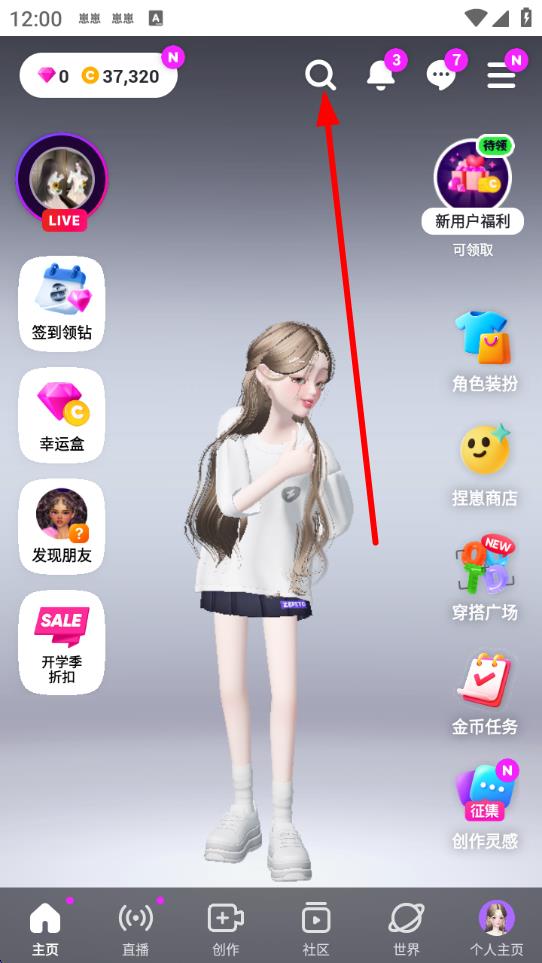 1、打開崽崽zepeto應(yīng)用,在主界面點(diǎn)擊上方的放大鏡搜索圖標(biāo)。