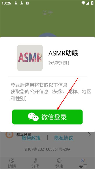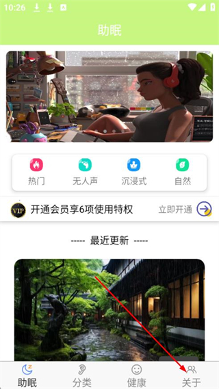 1、打開ASMR助眠app,點(diǎn)擊底部導(dǎo)航欄中的關(guān)于選項。