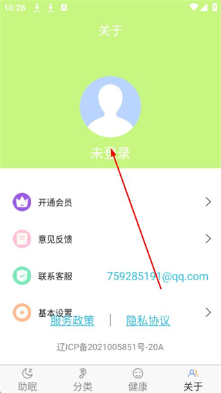 2、在關(guān)于頁面中,點(diǎn)擊未登錄區(qū)域。