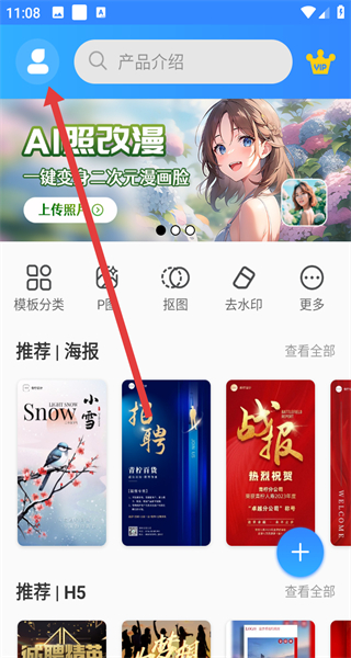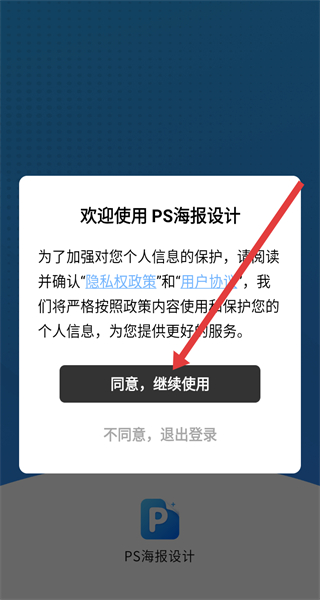 1、打開PS海報設(shè)計APP,點擊同意,繼續(xù)使用按鈕,確認(rèn)隱私權(quán)政策和用戶協(xié)議,進(jìn)入APP主界面。