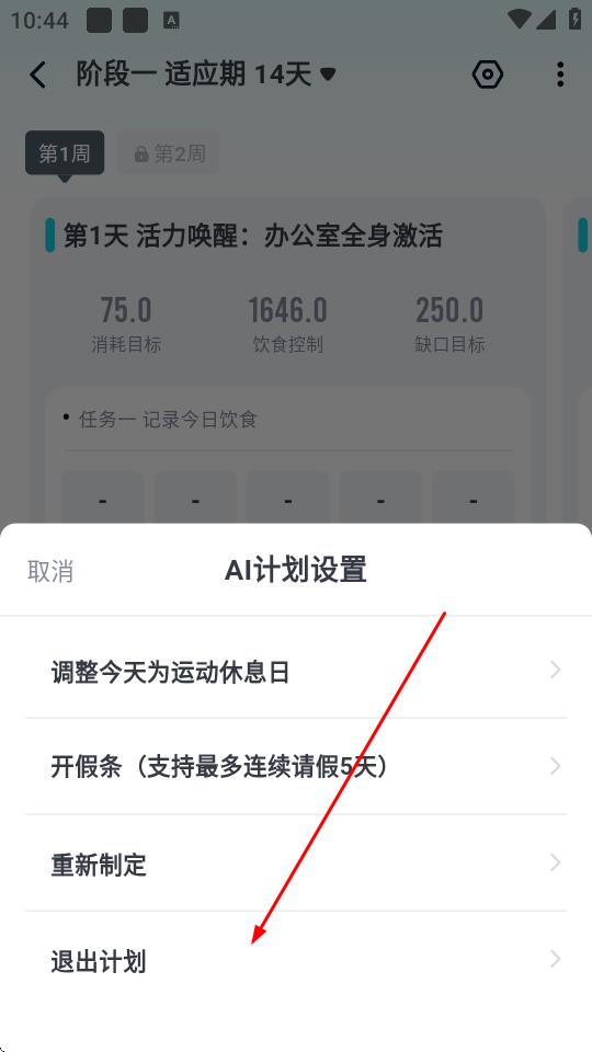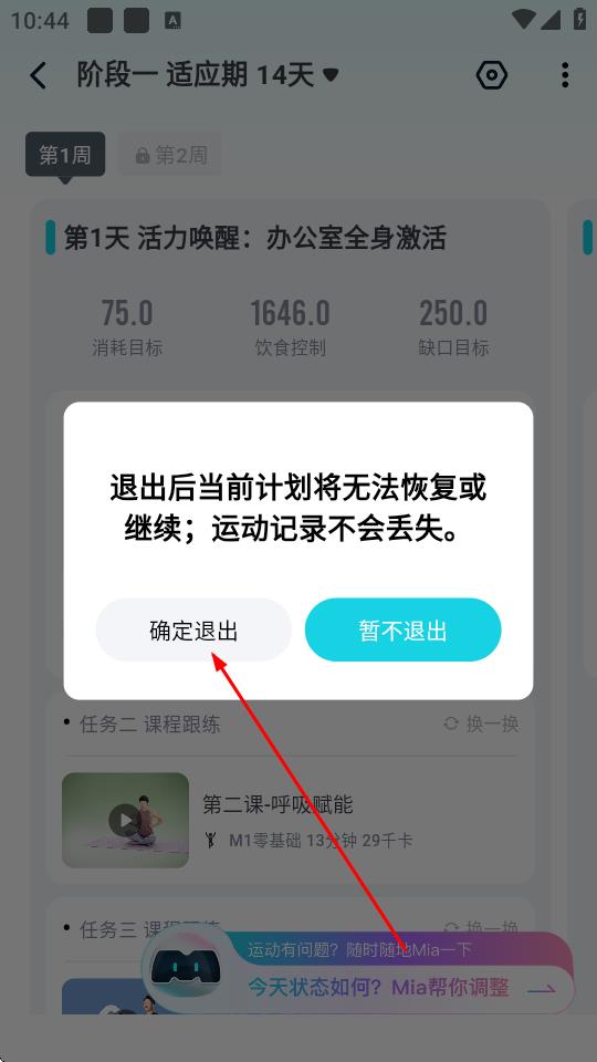 4、在確認(rèn)退出的彈窗中,點擊確定退出,即可刪除當(dāng)前的運(yùn)動計劃。