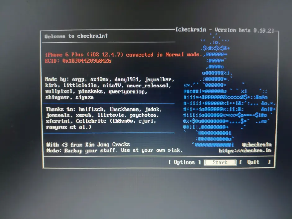 4、加載之后,進入Checkra1n界面,用數(shù)據(jù)線與手機相連,點擊“start”