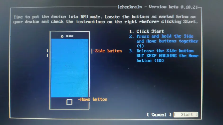 5、你會看下如下畫面,首先點擊“start”,然后再根據(jù)屏幕中提示來操作手機進入進入dfu模式