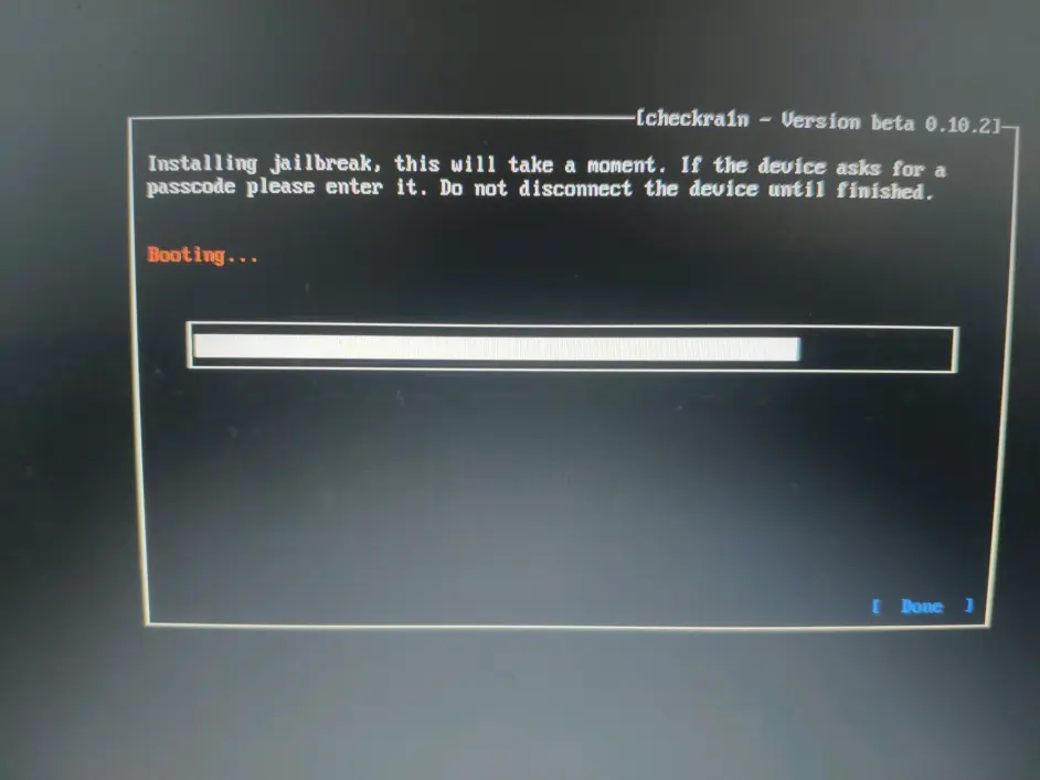 6、等待進度條讀取完畢,此時Checkra1n會加載引導(dǎo),手機會跑代碼并重啟