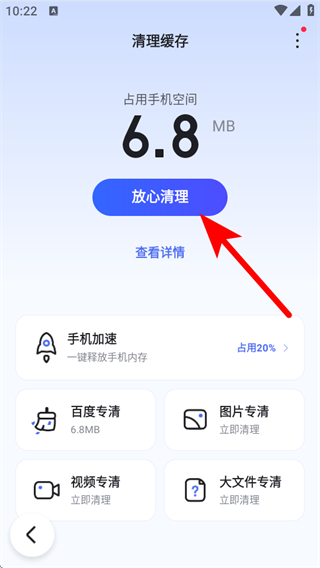 3、在清理緩存的頁面,點(diǎn)擊放心清理,完成緩存清理的操作。