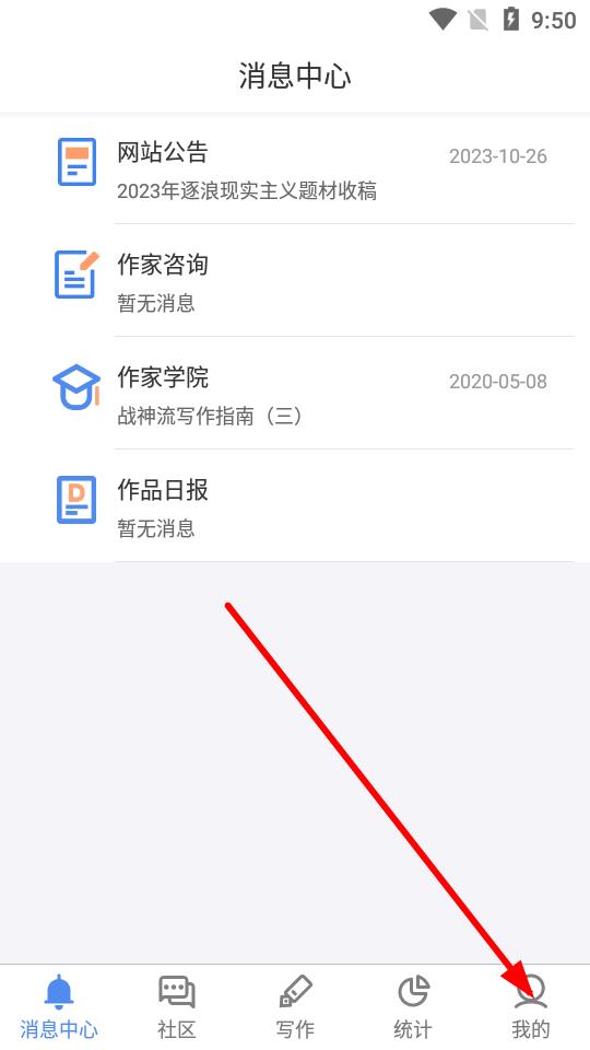1、打開逐浪作家助手,點(diǎn)擊消息中心頁面右下角我的。