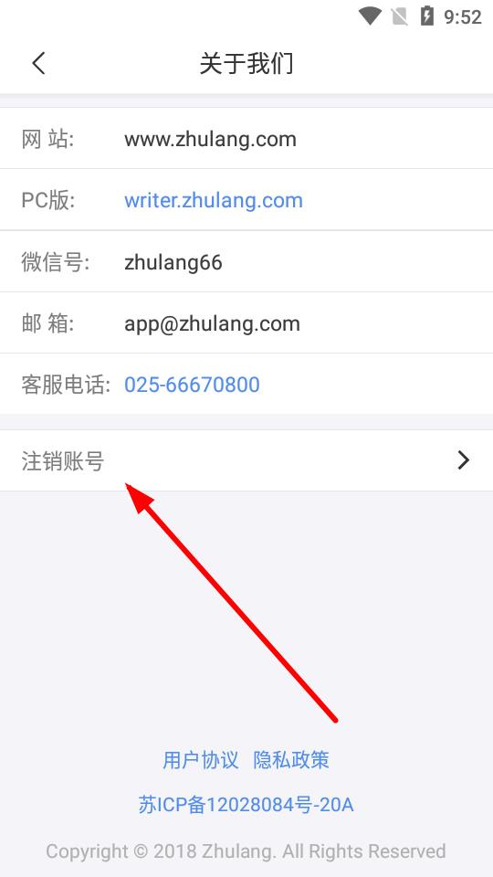 3、進(jìn)入關(guān)于我們頁面后,點(diǎn)擊下方的【注銷賬號(hào)選項(xiàng)。