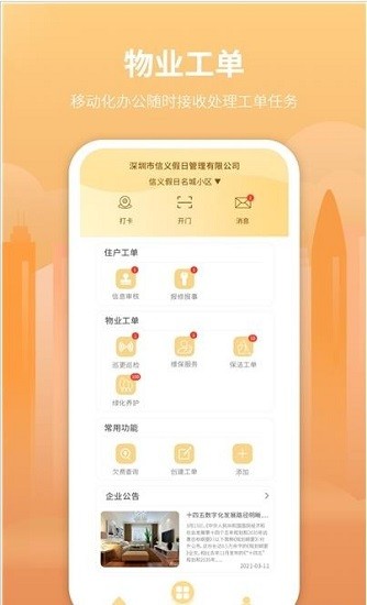 1.物業(yè)工單:移動化辦公,隨時接收處理工單任務(wù)。