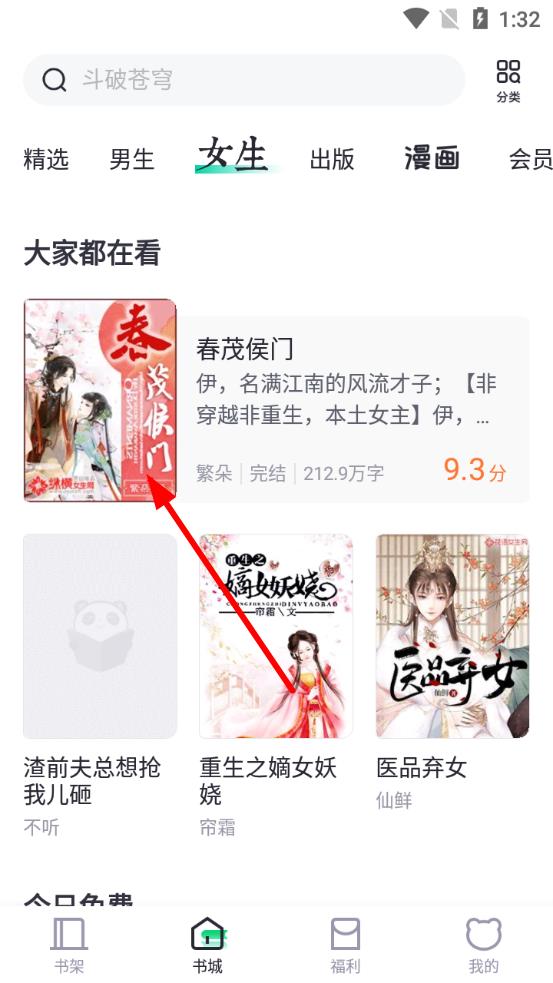 1、打開熊貓看書APP,點擊底部書城,在女生等分類下找到想閱讀的書籍,如春茂侯門。
