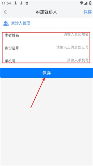 4、輸入患者姓名、身份證號、手機(jī)號,點(diǎn)擊保存按鈕。