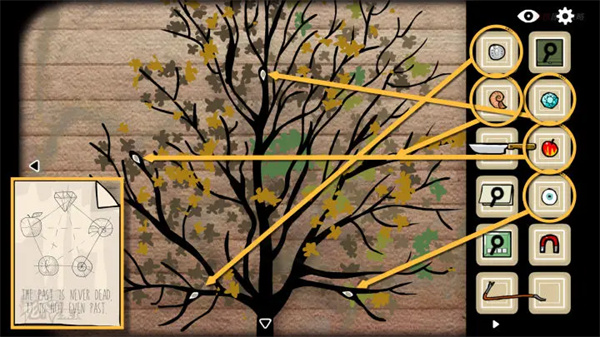 斗柜視角:將藍(lán)色【寶石】【蘋果】【貝殼】【硬幣】【眼睛】按照之前【紙】上給出的線索安置在樹杈的【眼睛】處