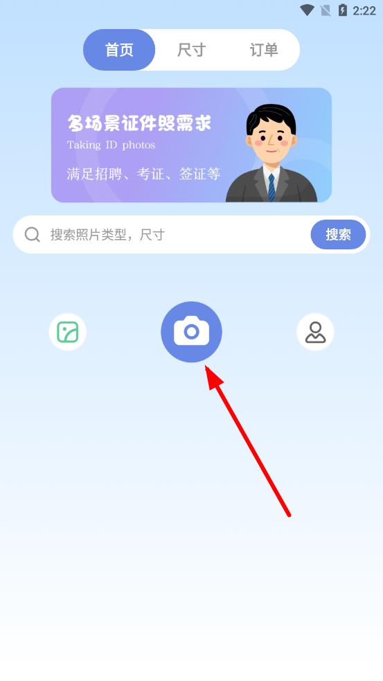 1、打開(kāi)自助證件照軟件,點(diǎn)擊中間圖標(biāo),進(jìn)入照片規(guī)格選擇頁(yè)面。