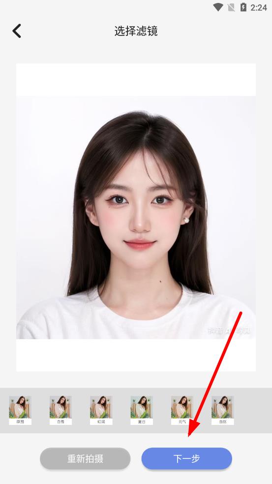 4、照片導(dǎo)入后會(huì)進(jìn)入選擇濾鏡界面,根據(jù)喜好選擇或不選濾鏡,然后點(diǎn)擊下一步,完成白底證件照制作。