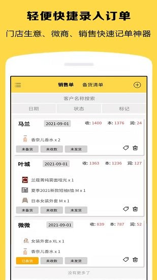 記訂單是一款輕便簡潔高效的做生意記銷售單、出入庫單工具,方便統(tǒng)計(jì)生意經(jīng)營情況,快捷微信客戶對賬,在傳統(tǒng)進(jìn)銷存的基礎(chǔ)上,做到操作更簡便,更符合賣家實(shí)際使用習(xí)慣的操作設(shè)計(jì),適合個體戶商家、微商、代購、批發(fā),快銷等場景使用。