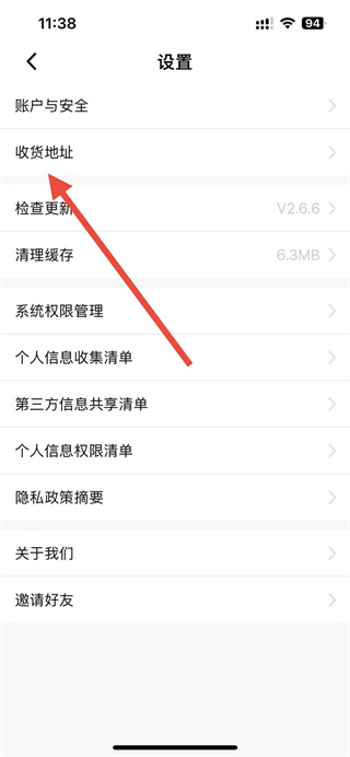 3、在設(shè)置頁面,點(diǎn)擊收貨地址選項(xiàng),進(jìn)入收貨地址頁面。