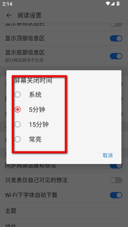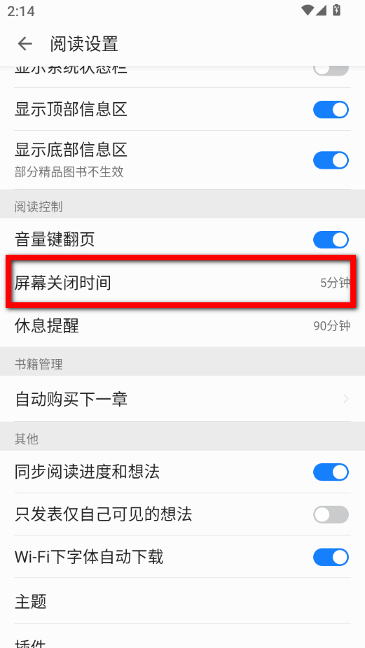 4、在閱讀設(shè)置界面,找到屏幕關(guān)閉時間選項并點擊。