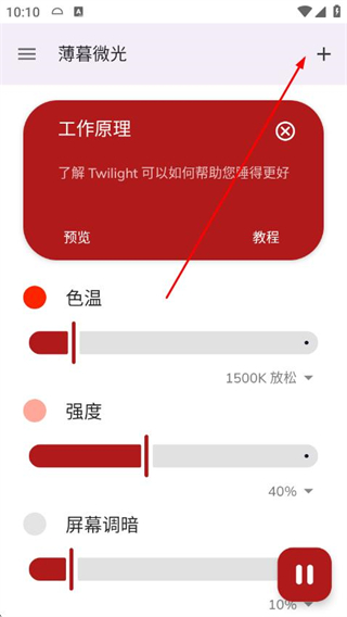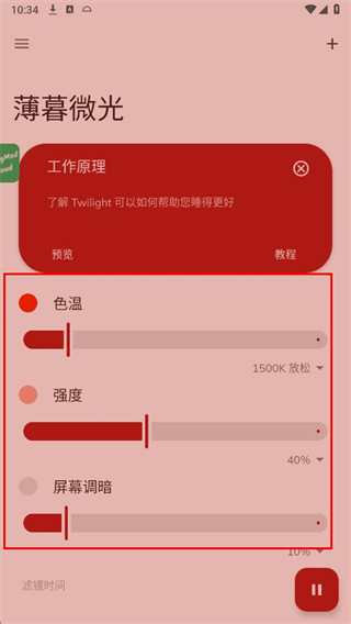 1、在薄暮微光APP中,可調(diào)節(jié)色溫、強(qiáng)度、屏幕調(diào)暗的滑塊,設(shè)置適合的顯示參數(shù)。