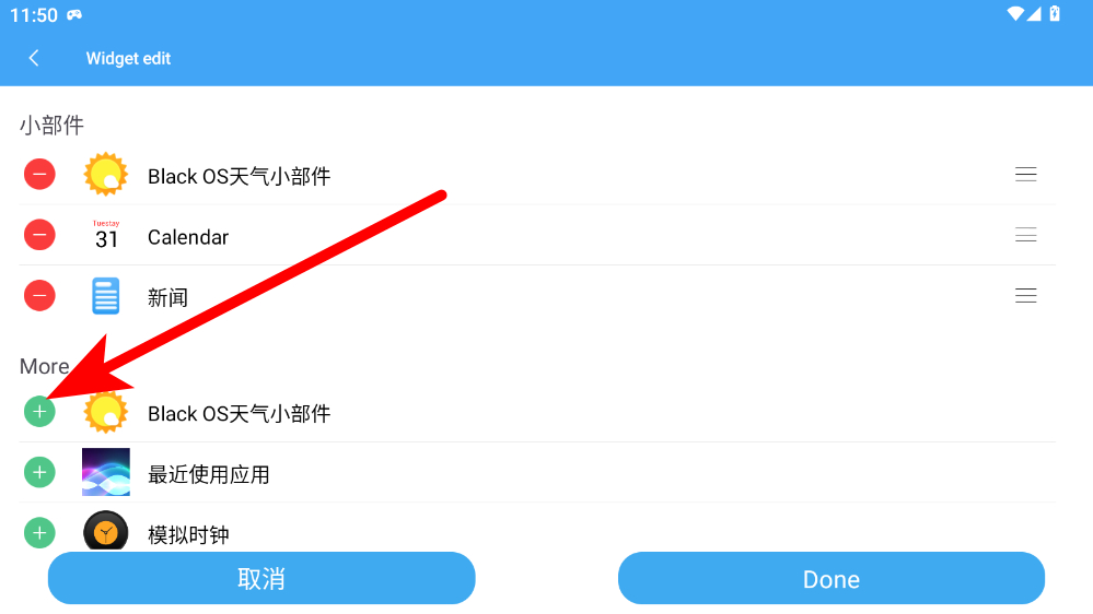 3、在小部件編輯頁面里,找到想要添加的組件,點擊其左側(cè)的+添加按鈕。