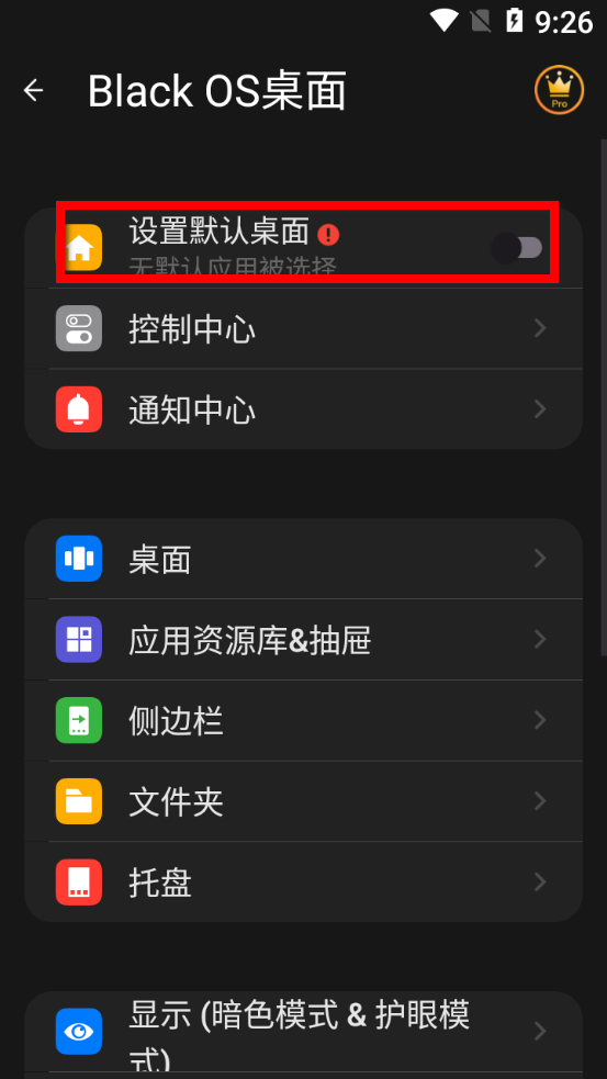 3、在Black OS桌面設置界面,點擊設置默認桌面的開關(guān),進入默認桌面選擇界面。