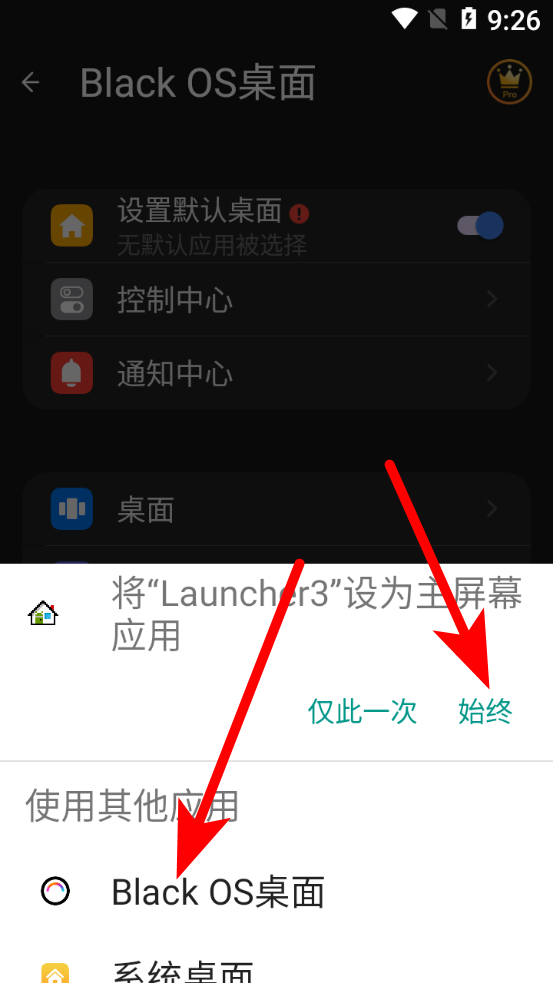 4、在默認桌面選擇界面,選擇Black OS桌面后,點擊始終選項,即可完成默認桌面設置操作。