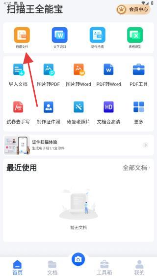 1、打開掃描王全能寶APP,在首頁找到掃描文件的圖標(biāo),點擊進入拍攝界面。
