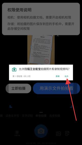 2、首次使用會彈出權(quán)限申請,需點擊允許授予相機拍攝、存儲讀寫權(quán)限,否則無法正常掃描。