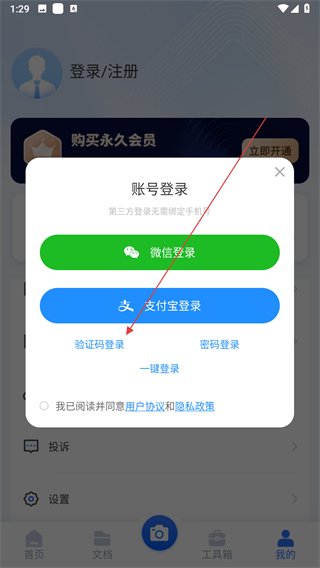 3、在登錄窗口里,選擇驗證碼登錄,切換到驗證碼登錄頁面。