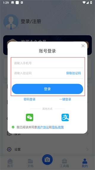 4、輸入手機號、獲取并填寫驗證碼后,點擊登錄按鈕完成操作。