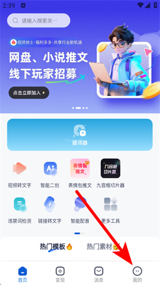 1、打開(kāi)創(chuàng)作貓APP,點(diǎn)擊底部導(dǎo)航欄的我的,進(jìn)入個(gè)人的頁(yè)面。
