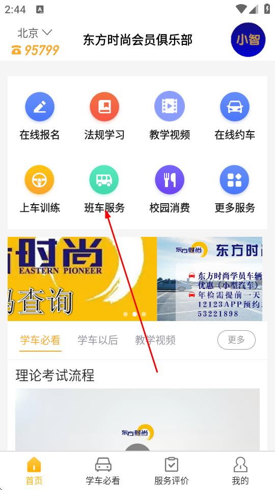 1、打開東方時尚會員俱樂部APP,進(jìn)入首頁。點(diǎn)擊班車服務(wù)選項(xiàng),進(jìn)入班車服務(wù)頁面。