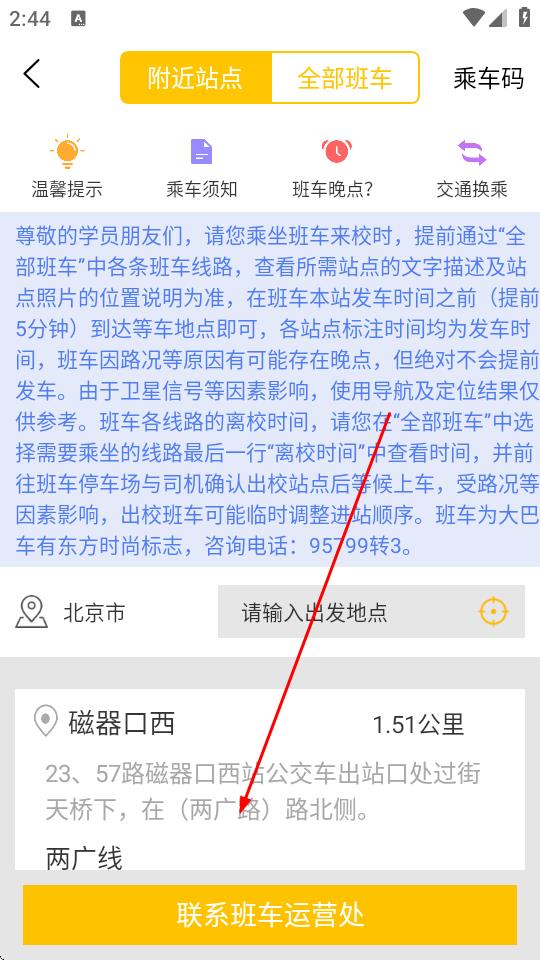 4、輸入完成后,系統(tǒng)會顯示相關(guān)的班車站點(diǎn)信息,選擇離你較近的班車站點(diǎn)。