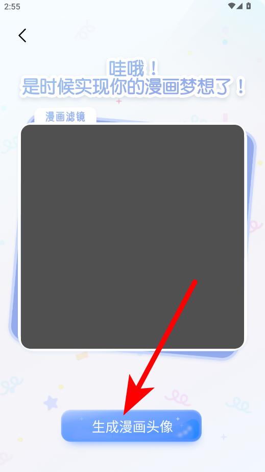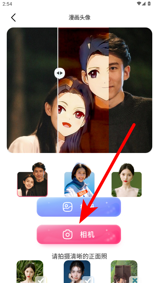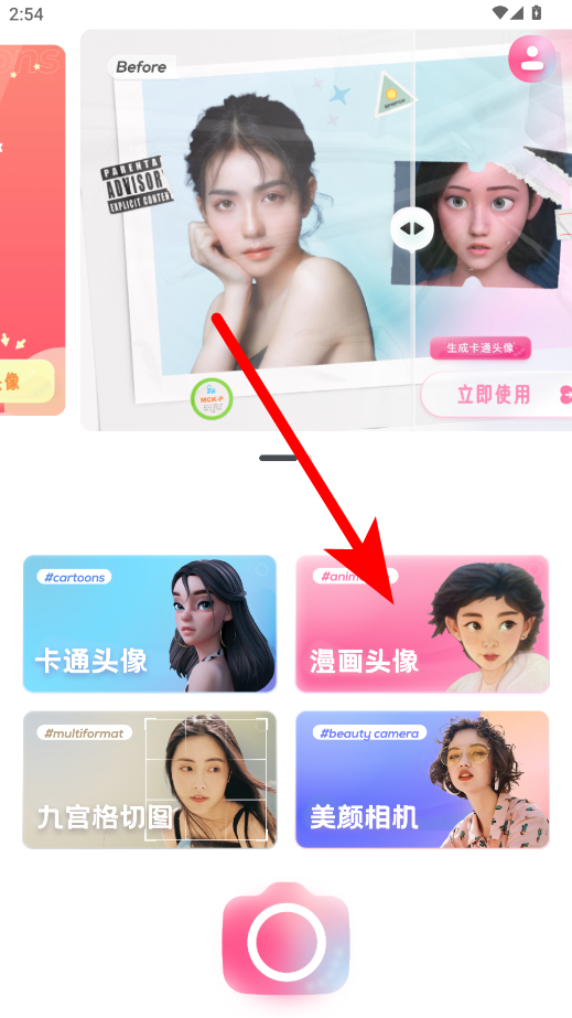 2、在漫畫頭像界面,點(diǎn)擊相機(jī)按鈕準(zhǔn)備拍攝照片。