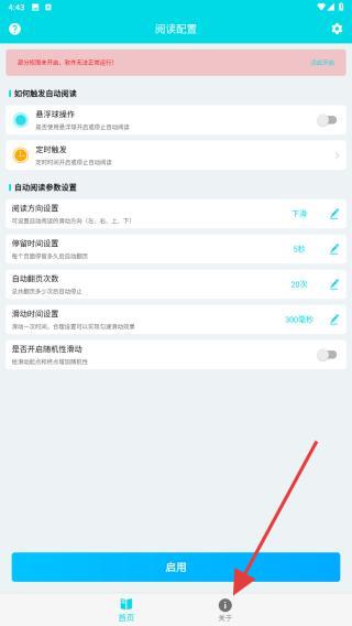 1、在自動(dòng)閱讀助手的閱讀配置頁面,點(diǎn)擊右下角關(guān)于選項(xiàng),進(jìn)入關(guān)于界面。