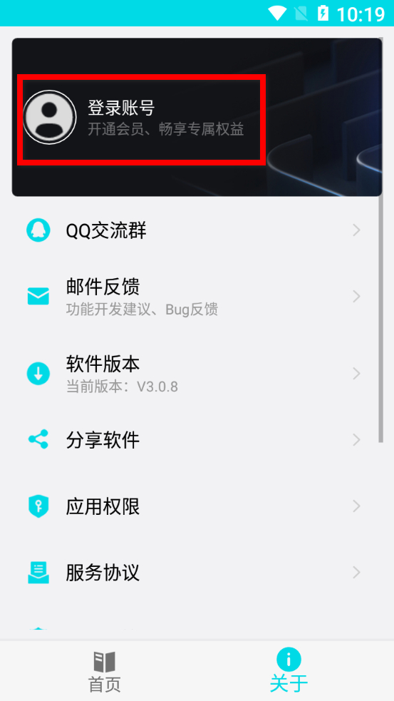 2、在關(guān)于界面,點(diǎn)擊登錄賬號(hào)選項(xiàng),進(jìn)入登錄準(zhǔn)備頁面。