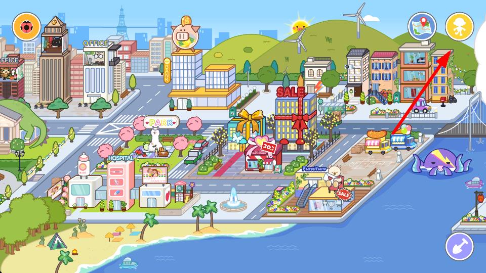 1、進入米加小鎮(zhèn)游戲主界面后,點擊右上角區(qū)域箭頭所指位置的相應圖標,進入角色選擇或創(chuàng)建入口。