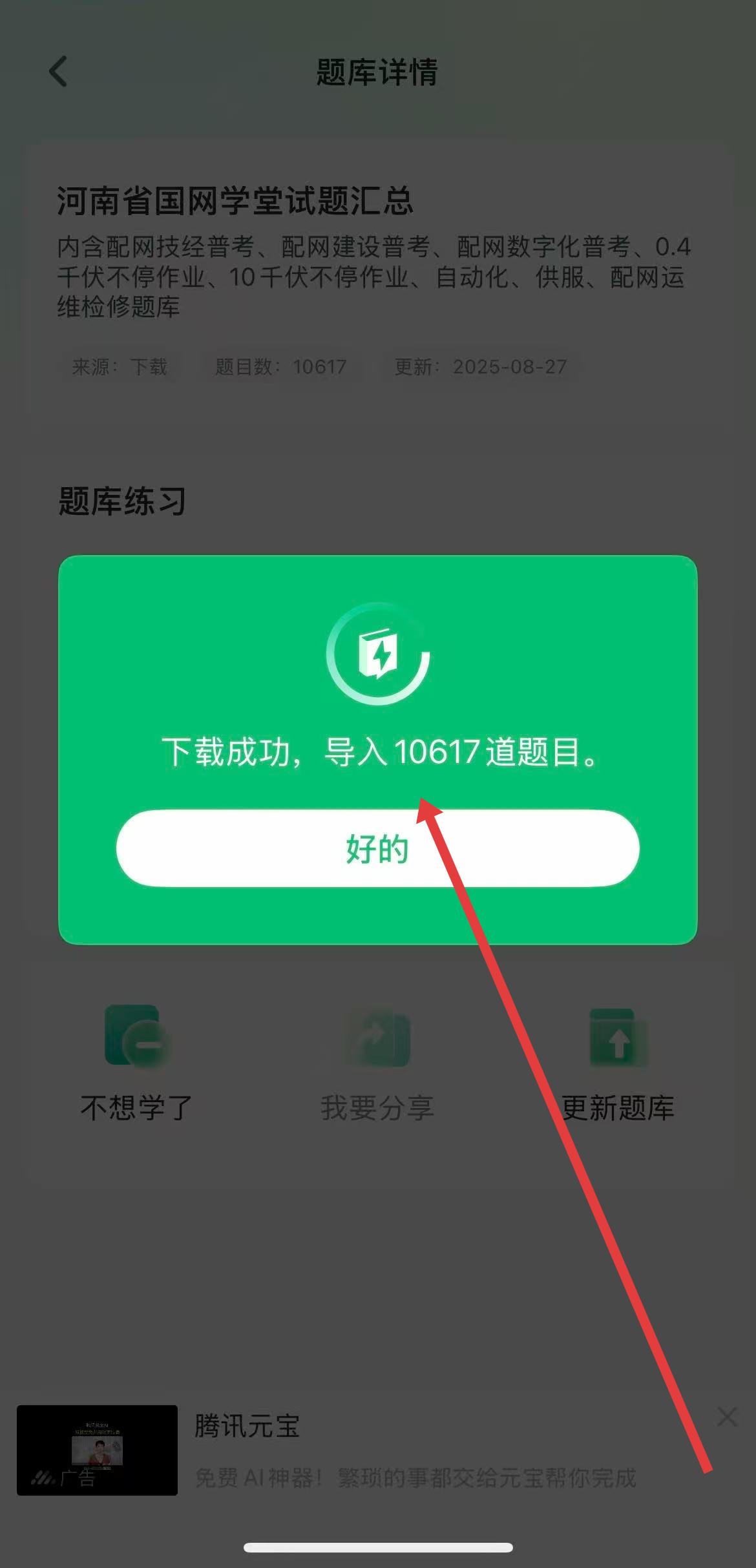 3、等待下載完成,出現(xiàn)下載成功提示后點(diǎn)擊好的,即可成功下載題庫(kù)。