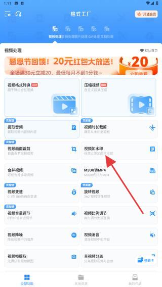 1、打開APP,在首頁視頻處理板塊找到并點擊視頻加水印,點擊后即可跳轉(zhuǎn)。