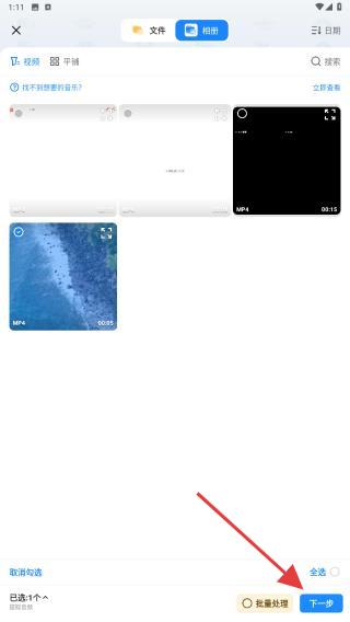 2、在視頻選擇的界面內(nèi),選擇后點擊右下方的按鈕。