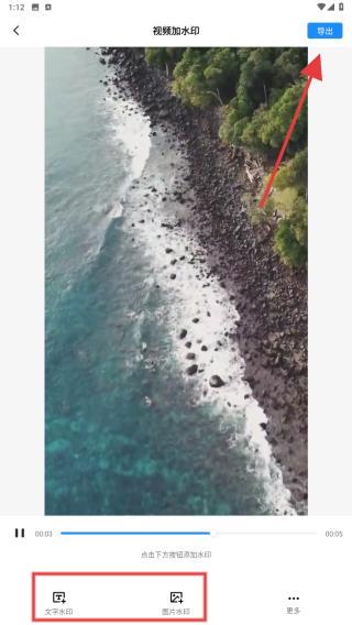 3、進(jìn)入編輯頁,底部提供文字水印和圖片水印兩種模式,水印樣式和位置確認(rèn)無誤后,點擊右上角導(dǎo)出。