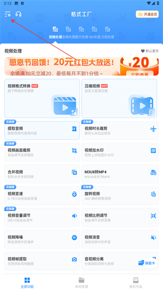 1、啟動格式工廠的APP,點擊首頁左上角設(shè)置的圖標(biāo)。