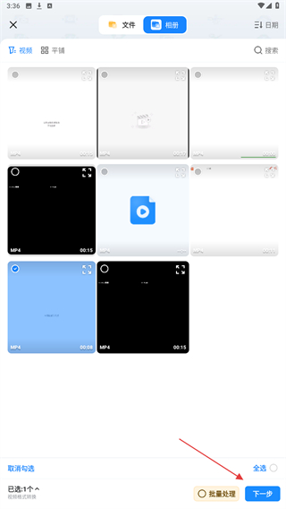 2、進(jìn)入文件選擇界面,勾選需添加水印的視頻,選好后點擊右下角下一步。