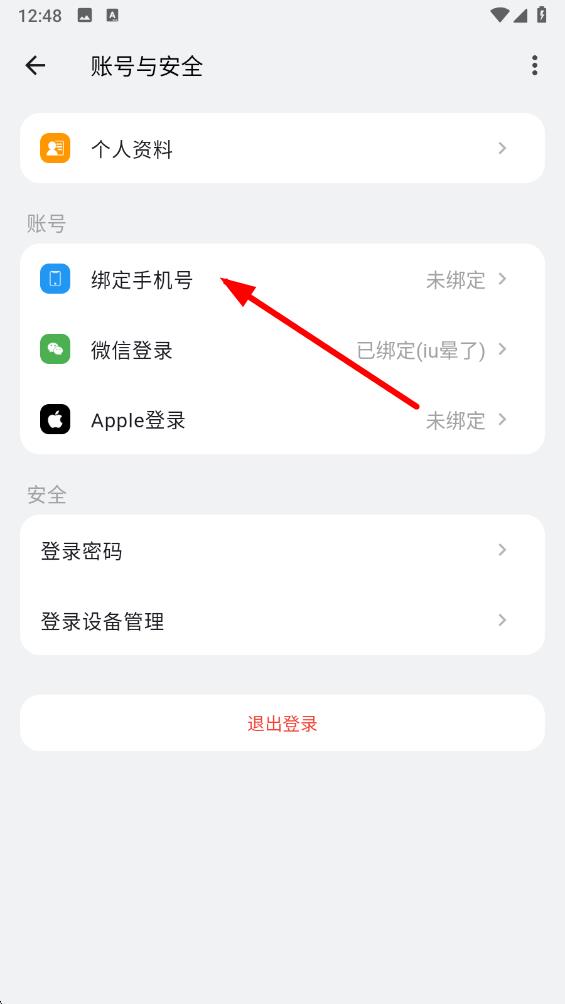 3、在賬戶與安全頁面,點(diǎn)擊綁定手機(jī)號選項(xiàng),進(jìn)入綁定手機(jī)號操作頁面。