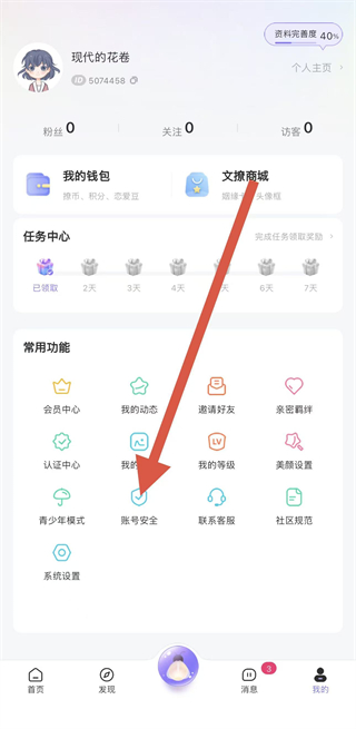 2、在個(gè)人頁(yè)面中,向下滑動(dòng)找到賬號(hào)安全選項(xiàng),點(diǎn)擊進(jìn)入賬號(hào)安全界面。