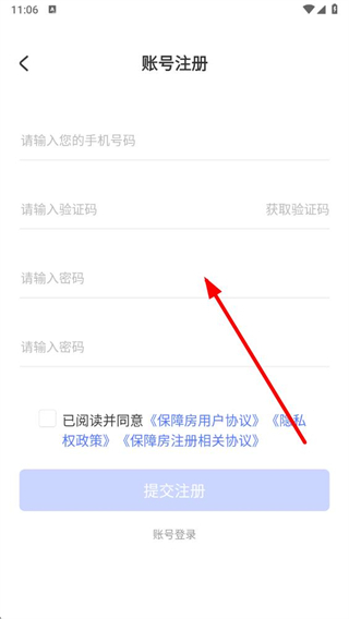 4、在注冊頁面,完成信息填寫后勾選相關(guān)協(xié)議,點擊提交注冊按鈕,即可完成北京保障房賬號的注冊。