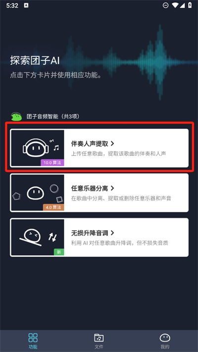1、進(jìn)入軟件后可以看到有多個(gè)功能可以選擇,伴奏人聲提取功能支持上傳任意歌曲并提取該歌曲的伴奏和人聲;