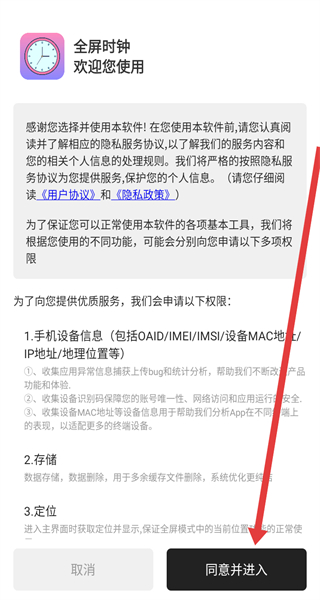 1、點擊同意并進入按鈕,同意全屏?xí)r鐘的隱私服務(wù)協(xié)議,進入APP主界面。