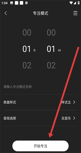 4、在專注模式設(shè)置界面,設(shè)置專注時長、專注模式名稱、表盤樣式和音效選擇后,點擊開始專注按鈕,即可進入專注模式。